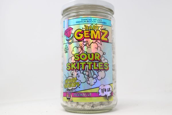 Baby Gemz Snowball – Sour Skittles brings a frosty punch of potency and flavor with diamond-infused, kief-coated “snowcap” buds. Each nug is crafted from premium indoor flower, ensuring smooth, powerful pulls packed with flavor and strength.