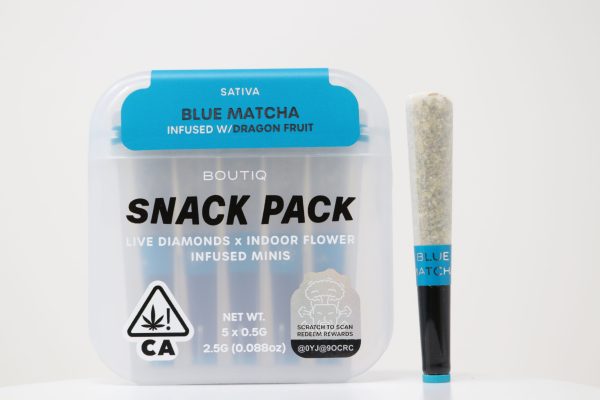 Each Snack Pack includes five perfectly rolled 0.5g pre-rolls (2.5g total), made only from premium whole flower — never trim or shake — ensuring consistent quality, slow burns, and clean exhales. Blue Matcha delivers balanced hybrid effects that promote mental clarity, creativity, and calm relaxation, making it a perfect choice for daytime flow or evening chill.