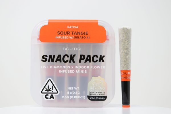 Wake up your senses with Boutiq Snack Pack (2.5g) – Sour Tangie, a lively sativa strain known for its tangy citrus aroma and motivating high. Each puff delivers an explosion of orange zest, tangerine, and diesel undertones, creating a bold, flavorful smoke that hits as bright as its name.