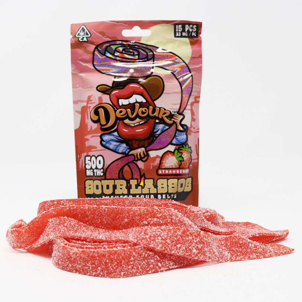 Effects: The effects of Devour Candy’s 500mg Sour Lassos can be intense and long-lasting due to their high THC concentration. Consumers can expect to experience strong psychoactive effects, including euphoria, relaxation, and altered perception. These effects may vary depending on individual tolerance, metabolism, and other factors.