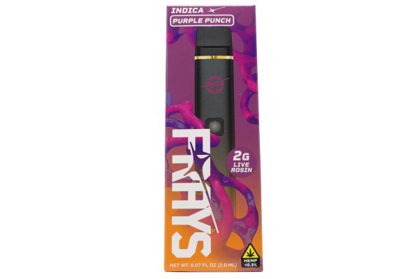 Experience Frays Dispo Live Rosin (2g) – Purple Punch, a 2g indica disposable infused with premium live rosin for a smooth, potent, and relaxing session. Purple Punch delivers calming body effects paired with gentle cerebral relaxation, perfect for unwinding after a long day or easing into a restful evening.