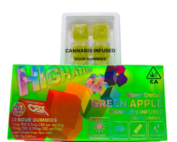 Highatus Gummies (100mg) – Green Apple offer a balanced, flavorful experience perfect for daytime wellness and mental clarity. Infused with a carefully formulated 2:1 ratio of THC to CBD, these gummies deliver the euphoric, uplifting benefits of Sativa while the added CBD helps smooth out any edginess—ideal for users seeking both relief and energy without overwhelming intensity.