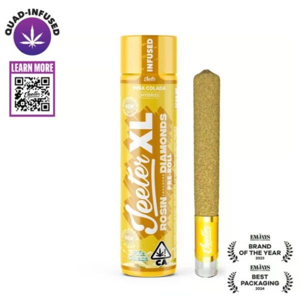 Jeeter XL Rosin Enhanced Diamonds Pre Roll (2g) – Pina Colada is a premium hybrid experience crafted for those who seek both potency and smooth flavor. Each 2g pre-roll is packed with top-shelf flower infused with rosin-enhanced diamonds, delivering an elevated and flavorful smoke that’s both potent and refined.