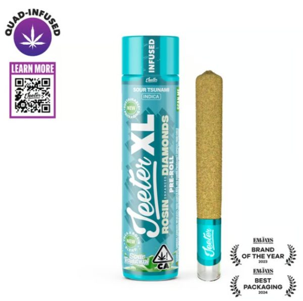 Jeeter XL Rosin Enhanced Diamonds Pre Roll (2g) – Sour Tsunami is a potent indica pre-roll crafted to deliver a deep, relaxing experience. Infused with rosin-enhanced diamonds, it enhances the smooth, earthy flavors of the classic Sour Tsunami strain with a touch of citrus and sourness. The high THC content ensures that every puff is both flavorful and powerful, offering a stress-relieving and calming high that is perfect for the end of the day or unwinding after a long week.